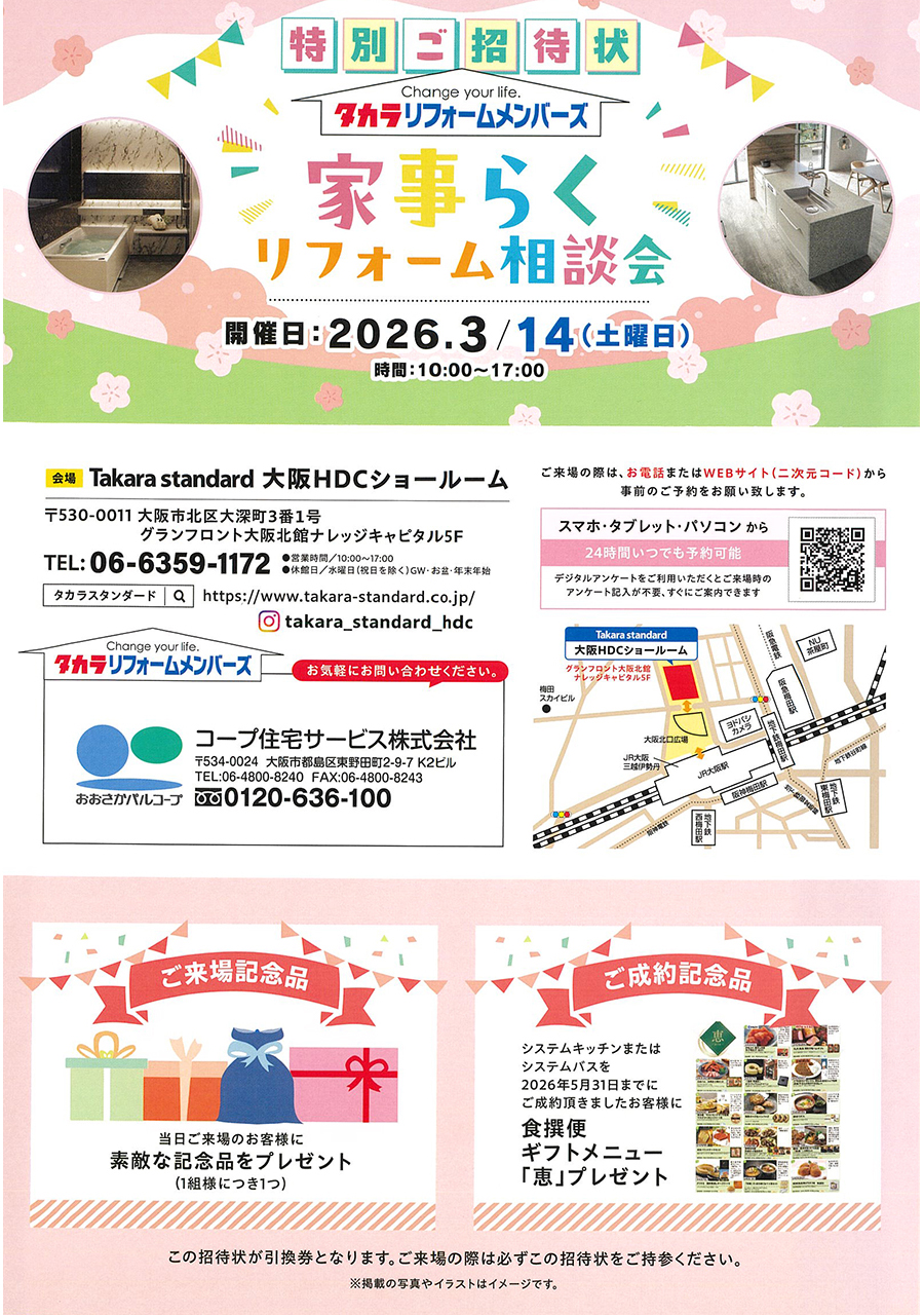 家事らくリフォーム相談会 2026.03.10 イベント 2026.03.14 イベント一覧に戻る 終了したイベント 茨木住まいのリフォームフェア 2026.02.12 イベント 開催終了 枚方 ショールーム 水廻り相談会 2026.01.28 イベント 開催終了 水廻りリフォーム相談会 2026.01.13 イベント 開催終了 水廻りリフォーム相談会 2025.12.16 イベント 開催終了 TOTO 冬のクリスマスフェア 2025.12.05 イベント 開催終了 タカラスタンダード 水廻り相談会 ホーロー祭り 2025.11.06 イベント 開催終了 水廻りリフォーム相談会 2025.10.10 イベント 開催終了 リフォーム感謝祭 2025.09.25 イベント 開催終了 高槻住まいのリフォームフェア 2025.08.20 イベント 開催終了 ショールーム見学ツアー 2025.08.20 イベント 開催終了 夜から住まいの相談会 2025.08.20 イベント 開催終了 リフォーム相談会 2025.07.07 イベント 開催終了 あなたのまちの外壁相談会 2025.07.07 イベント 開催終了 水廻りリフォーム相談会 2025.07.07 イベント 開催終了 枚方住まいのリフォームフェア 2025.05.23 イベント 開催終了 Panasonicキッチンまるわかりツアー 2025.05.13 イベント 開催終了 吹田住まいのリフォームフェア 2025.04.25 イベント 開催終了 還元水素水体験会 2025.04.03 イベント 開催終了 トリプルワイドIH体験イベント 2025.04.03 イベント 開催終了 パーソナルカラーで整える 心地よいファッション&インテリア 2025.04.03 イベント 開催終了 水廻りリフォーム相談会 2025.03.21 イベント 開催終了 DIYワークショップ 2025.02.20 イベント 開催終了 住まいの相談会 2025.02.20 イベント 開催終了 トリプルワイドIH体験イベント 2025.02.20 イベント 開催終了 子どものできるが広がる片付け講座 2025.02.20 イベント 開催終了 茨木住まいのリフォームフェア 2025.02.17 イベント 開催終了 外壁塗装業者案内会 2025.01.10 イベント 開催終了 住まいの相談会 2025.01.10 イベント 開催終了 水廻りショールーム見学会 2025.01.10 イベント 開催終了 住まいフェア in 京橋 2024.10.30 イベント 開催終了 失敗しない外壁塗装 学習会&相談会 2024.10.30 イベント 開催終了 住まいのリフォームフェア・住まいの相談会・補助金リフォーム相談会(6月・7月) 2024.08.05 イベント 開催終了 水廻りショールーム見学会 [要予約] 2024.08.05 イベント 開催終了 大今里コーポラティブ住宅 参加者募集開始!!計画地:大阪市東成区大今里4丁目 2024.08.05 イベント 開催終了 瑞光四丁目コーポラティブハウス 説明会開催! 2024.08.05 イベント 開催終了 四天王寺夕陽ヶ丘コーポラティブハウス 説明会開催! 計画地:天王寺区真法院町 2024.08.05 イベント 開催終了 吹田市山田東コミュニティ型戸建住宅IENIWA住宅 募集開始! 計画地:吹田市山田東 2024.08.05 イベント 開催終了