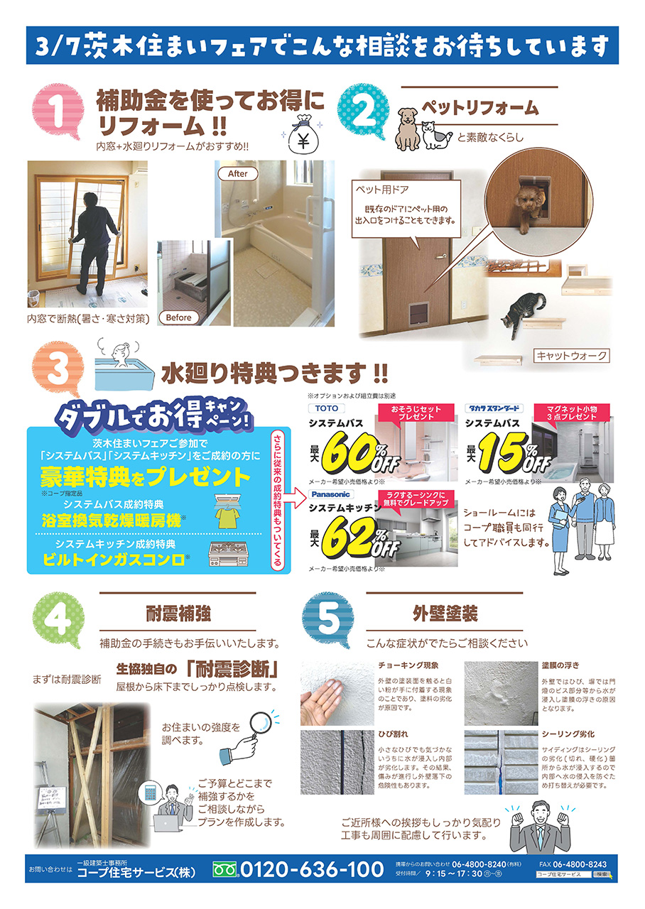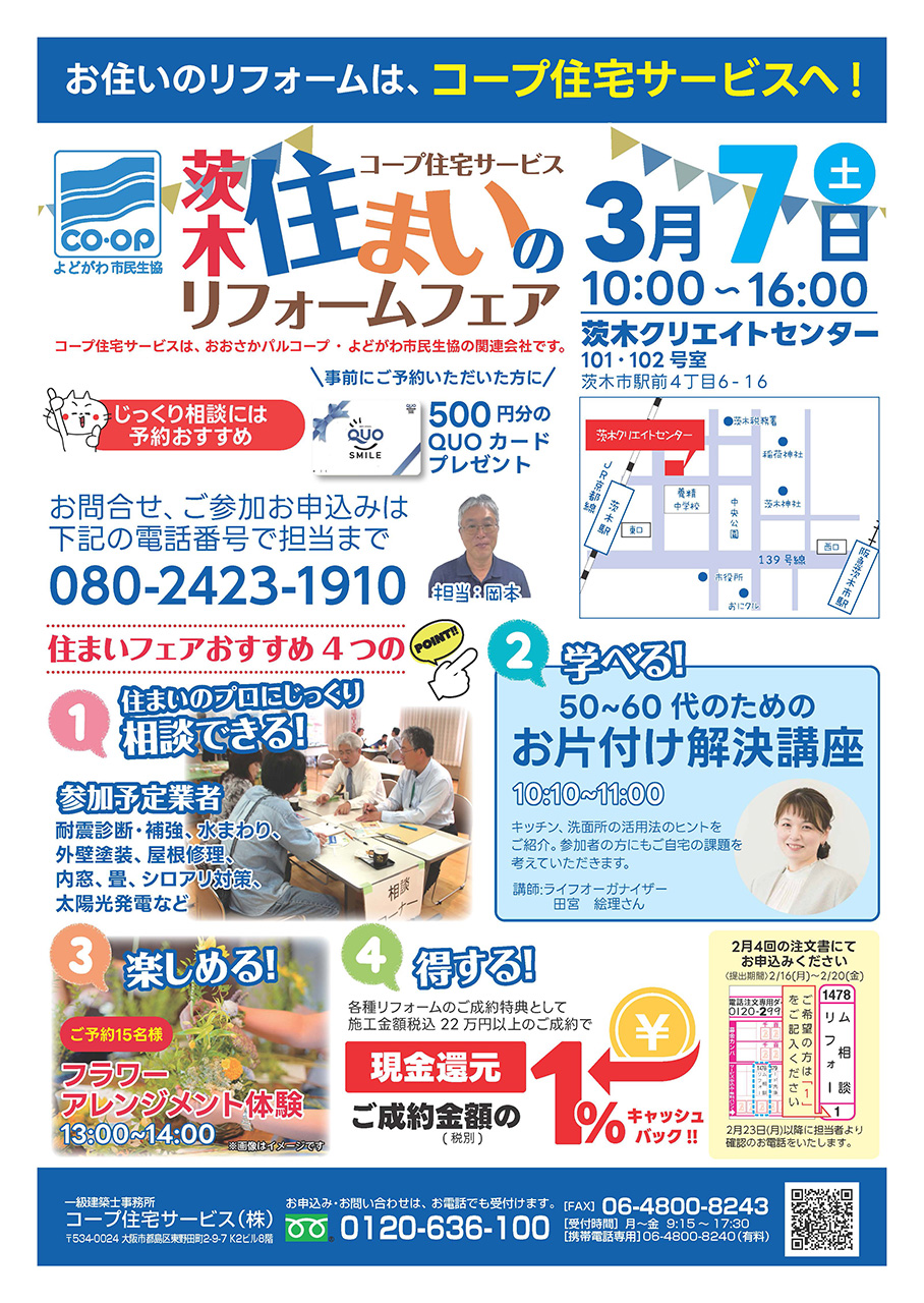 耐震診断・水まわり・外壁塗装・屋根修理・内窓など、住まいのプロにじっくりご相談していただけます。フラワーアレンジメント体験やお片付け解決講座で楽しんだり、学んだりすることができます。